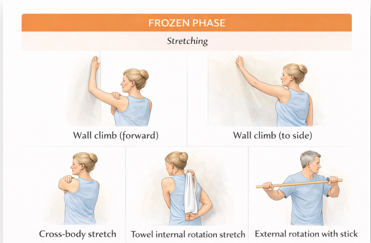 forcing aggressive stretching during the painful (inflamed) stage, which can increase irritation and slow down recovery. In frozen shoulder, what you do depends on when. And that brings us to the next section.