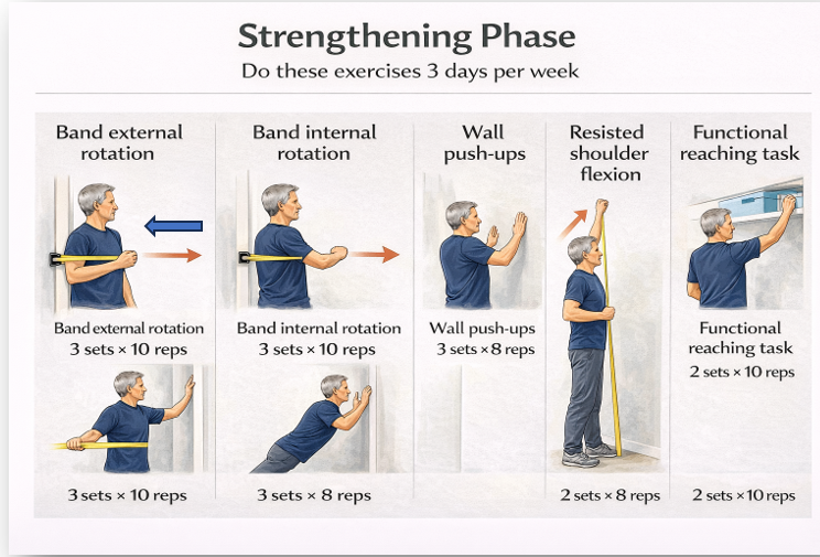 Once pain has reduced and movement has started to return, your shoulder enters what we call the Strengthening Phase.