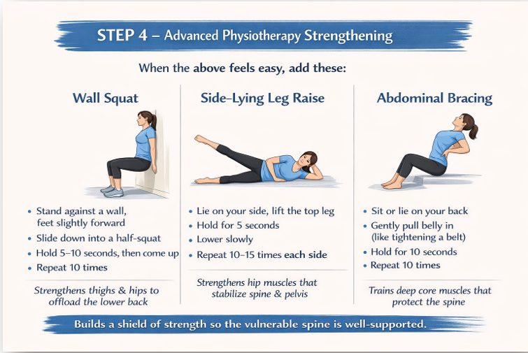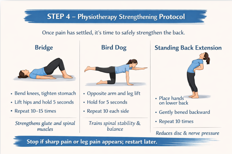 Once pain and stiffness have reduced and simple movements feel comfortable, the next step is to make the back strong again. This phase is essential because most back pain returns not due to injury, but due to weak support muscles. Strengthening these muscles allows the spine to stay protected during daily activities like bending, lifting, and walking.